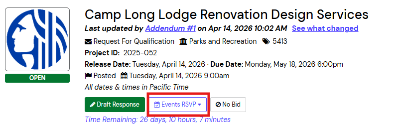 Please use the OpenGov Events RSVP features (see below) to register for the Pre-submittal Conference to receive the Microsoft Teams link. The Pre-submittal Conference will be held this Thursday (April 23) at 12:00 pm. Please register by April 23 at 10:00 am to be included. Note: the meeting link will be sent to the email address associated with your OpenGov account.