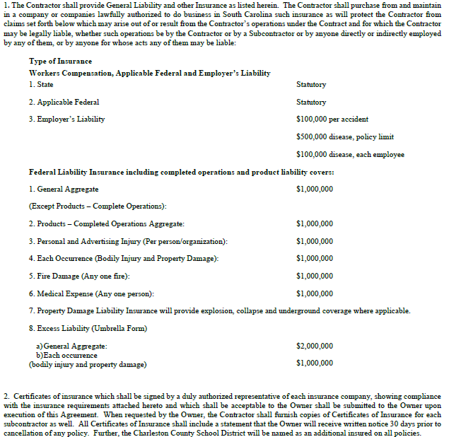 CONTRACTOR’S LIABILITY INSURANCE - GENERAL (a) Without limiting any of the obligations or liabilities of Contractor, Contractor shall procure from a company or companies lawfully authorized to do business in South Carolina and with a current A.M. Best rating of no less than A: VII, and maintain for the duration of the contract, insurance against claims for injuries to persons or damages to property which may arise from or in connection with the performance of the work and the results of that work by the contractor, his agents, representatives, employees or subcontractors. (b) Coverage shall be at least as broad as: (1) Commercial General Liability (CGL): Insurance Services Office (ISO) Form CG 00 01 12 07 covering CGL on an “occurrence” basis, including products-completed operations, personal and advertising injury, with limits no less than $1,000,000 per occurrence. If a general aggregate limit applies, the general aggregate limit shall be twice the required occurrence limit. This contract shall be considered to be an “insured contract” as defined in the policy. (2) Auto Liability: ISO Form Number CA 00 01 covering any auto (Code 1), or if Contractor has no owned autos, hired, (Code 8) and non-owned autos (Code 9), with limits no less than $1,000,000 per accident for bodily injury and property damage. (3) Worker’s Compensation: As required by the State of South Carolina, with Statutory Limits, and Employer’s Liability Insurance with limit of no less than $1,000,000 per accident for bodily injury or disease. (c) CCSD, and the officers, officials, employees and volunteers of any of them, must be covered as additional insureds on the CGL policy with respect to liability arising out of work or operations performed by or on behalf of the Contractor including materials, parts or equipment furnished in connection with such work or operations. General liability coverage can be provided in the form of an endorsement to the Contractor’s insurance at least as broad as ISO Form CG 20 10 11 85 or if not available, through the addition of both CG 20 10 and CG 20 37 if a later edition is used. (d) For any claims related to this contract, the Contractor’s insurance coverage shall be primary insurance as respects CCSD, and the officers, officials, employees and volunteers of any of them. Any insurance or self-insurance maintained by CCSD, or the officers, officials, employees and volunteers of any of them, shall be excess of the Contractor’s insurance and shall not contribute with it. (e) Prior to commencement of the work, the Contractor shall furnish CCSD with original certificates and amendatory endorsements or copies of the applicable policy language effecting coverage required by this section. All certificates are to be received and approved by CCSD before work commences. However, failure to obtain the required documents prior to the work beginning shall not waive the Contractor’s obligation to provide them. CCSD reserves the right to require complete, certified copies of all required insurance policies, including endorsements required by this section, at any time. (f) Should any of the above described policies be cancelled before the expiration date thereof, notice will be delivered in accordance with the policy provisions. In addition, the Contractor shall notify CCSD immediately upon receiving any information that any of the coverages required by this section are or will be changed, cancelled, or replaced. (g) Contractor hereby grants to CCSD a waiver of any right to subrogation which any insurer of said Contractor may acquire against CCSD by virtue of the payment of any loss under such insurance. Contractor agrees to obtain any endorsement that may be necessary to effect this waiver of subrogation, but this provision applies regardless of whether or not CCSD has received a waiver of subrogation endorsement from the insurer. (h) Any deductibles or self-insured retentions must be declared to and approved by CCSD. CCSD may require the Contractor to purchase coverage with a lower deductible or retention or provide proof of ability to pay losses and related investigations, claim administration, and defense expenses within the retention. (i) CCSD reserves the right to modify these requirements, including limits, based on the nature of the risk, prior experience, insurer, coverage, or other special circumstances. In no event shall any failure of CCSD to receive certified copies or certificates of policies required herein or to demand receipt of such certified copies or certificates prior to the Contractor’s commencing the Work be construed