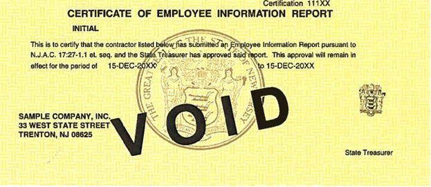All bidders are urged to submit with their bid, a copy of their firm’s Certificate of Employee Information Report. Failure to submit the Certificate prior to the award will result in the rejection of the bid.