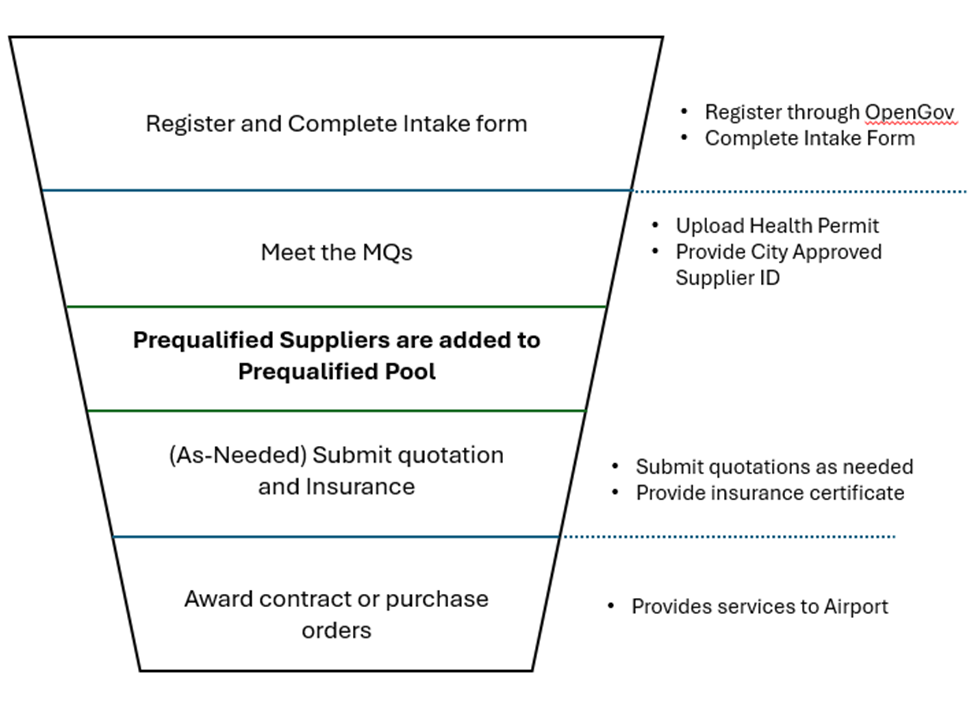 Airport is issuing this Solicitation to identify and prequalify Respondents qualified to provide as‑needed catering services in support of Airport events. Respondents who are successfully added to the Airport’s Prequalified Pool may be contacted on an as‑needed basis to provide catering services that align with the specific requirements of each event as detailed in this RFQ. Other City Departments may also use the Prequalified Pool as described in this RFQ.