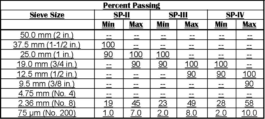 Note 5: The “Nominal Maximum Sieve” for a SP-1 PMBP gradation shall be the 37.5mm (1-1/2 in) sieve, for a SP-II PMBP gradation shall be the 25.0mm (1 in) sieve, for a SP-III PMBP gradation shall be the 19.0mm (3/4 in) sieve, and for a SP-IV PMBP gradation shall be the 12.5mm (1/2 in) sieve.