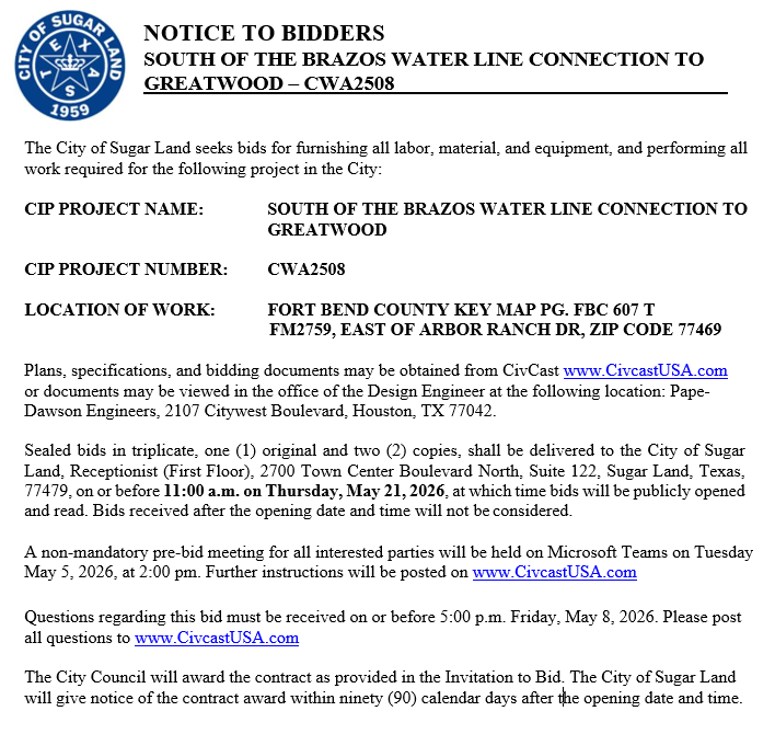 City means the City of Sugar Land, Texas, owner of the Project.